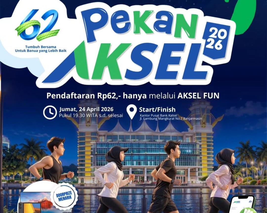 Bank Kalsel menghadirkan Aksel Fun Night Run 5K sebagai salah satu agenda utama dalam rangkaian Pekan AKSEL 2026. Kegiatan lari malam ini dijadwalkan berlangsung pada Jumat (24/4/2026), mulai pukul 19.30 WITA hingga selesai, dengan titik start dan finish di Kantor Pusat Bank Kalsel.