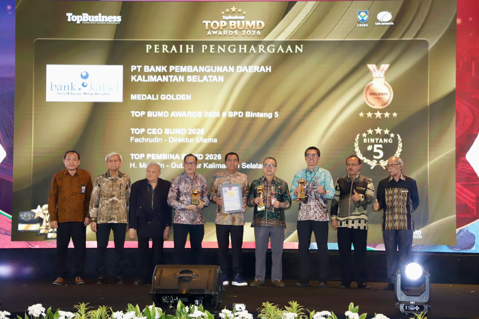 Selain itu, Bank Kalsel juga meraih penghargaan TOP BUMD Awards 2026 BPD Bintang 5, sementara Direktur Utama Bank Kalsel Fachrudin dinobatkan sebagai TOP CEO BUMD 2026. Di sisi lain, Gubernur Kalimantan Selatan H. Muhidin turut menerima penghargaan sebagai TOP Pembina BUMD 2026.