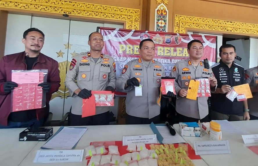 Barang bukti disita diperlihatkaan Plh Kapolresta Banjarmasin Kombes Pol Timbur RK Siregar didampingi Wakapolresta AKBP Arwin Amrih Wientama, Kasat Resnarkoba Kompol Syuaib Abdullah dan Kasat Polairud Kompol Dading Kalbu Adie, Selasa (7/4/2026).
