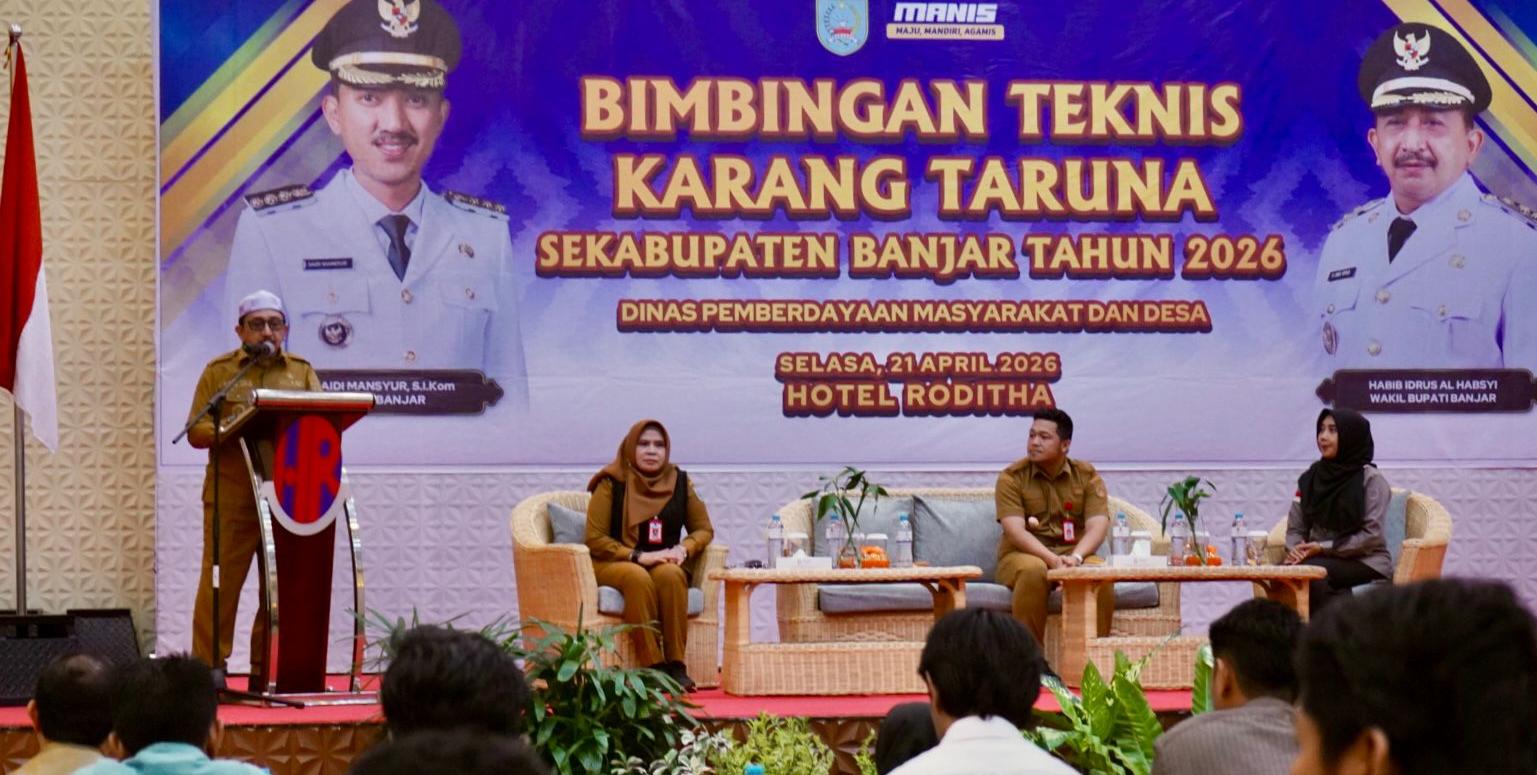 Pemerintah Kabupaten (Pemkab) Banjar melalui Dinas Pemberdayaan Masyarakat dan Desa (DPMD) menggelar bimbingan teknis (bimtek) Karang Taruna se-Kabupaten Banjar, dalam meningkatkan kapasitas pemuda agar mampu berkontribusi lebih aktif mendukung pembangunan daerah, Selasa (21/4/1026) berlangsung di Hotel Roditha Banjarbaru.