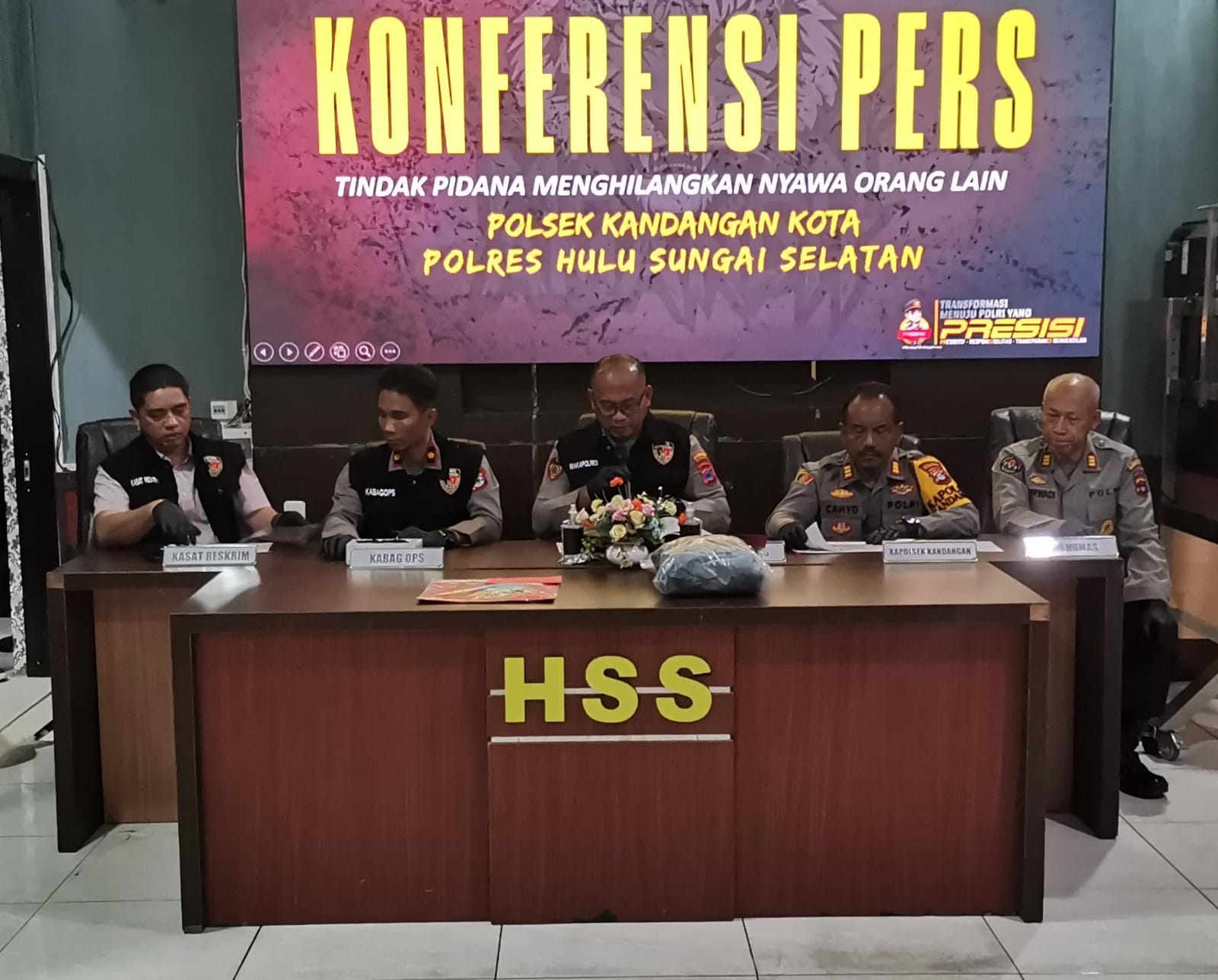 HULU SUNGAI SELATAN, koranbanjar.com – Wakapolres HSS Kompol Riswiadi memimpin konferensi pers terkait kasus tersebut, Jumat (17/4/2026) di Aula Mapolres HSS, didampingi Kabagops Kompol Achmad Jarkasi, Kapolsek Kandangan Kota AKP Cahyo Sugiono, Kasatreskrim Iptu Felly Manurung, dan Kasi Humas AKP Purwadi.