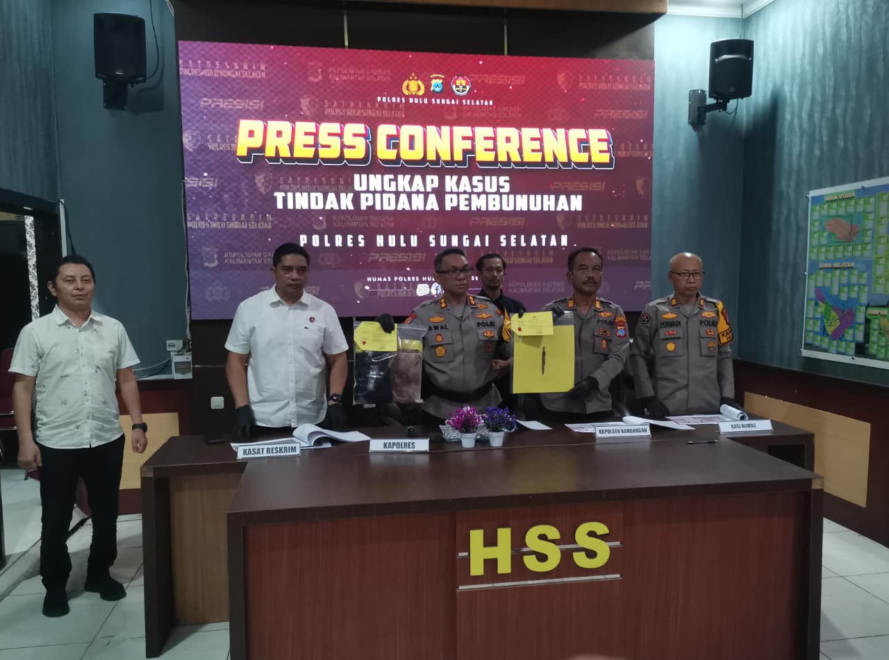 Kepolisian Resor (Polres) Hulu Sungai Selatan (HSS) menggelar konferensi pers perkara penganiayaan berujung korban tewas, Kamis (12/3/2026) di Aula Mapolres HSS, Jalan Jenderal Sudirman, Desa Hamalau, Kecamatan Sungai Raya.