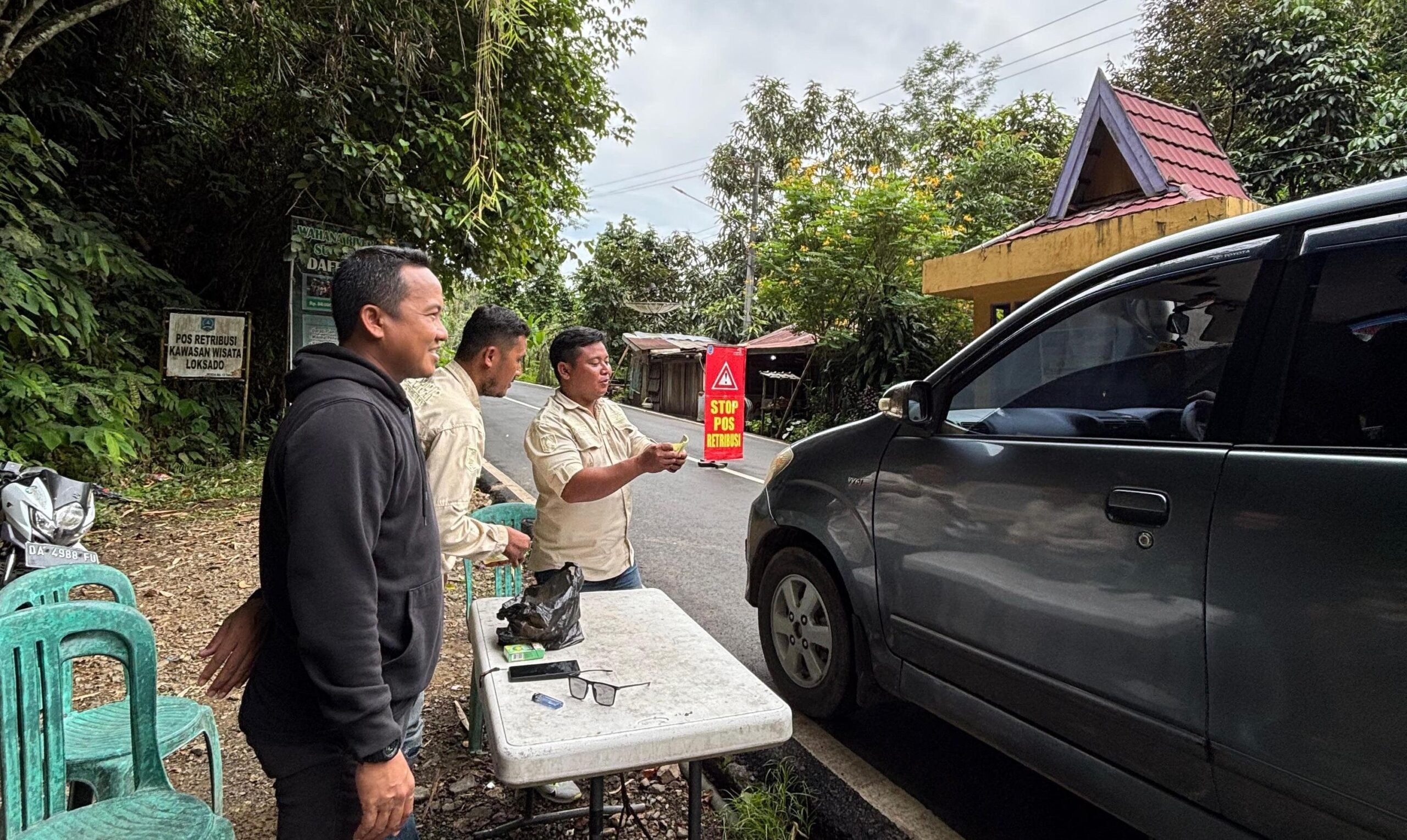 HULU SUNGAI SELATAN, koranbanjar.com – Pos retribusi masuk KSPN di Jalan Loksado, Dusun Muara Hatib, Desa Hulu Banyu menerima pembayaran QRIS.
